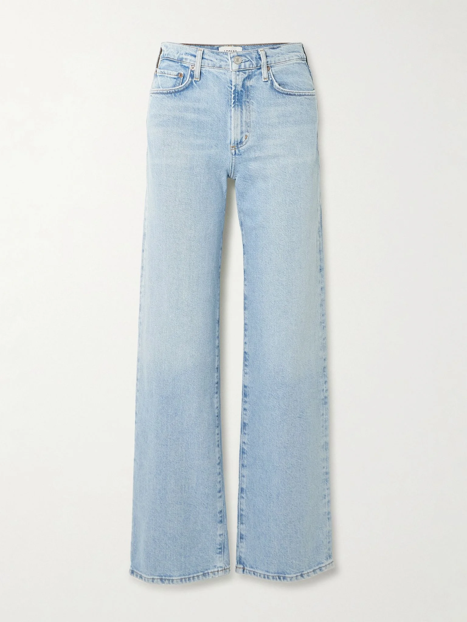 AGOLDE's 'Harper' jeans are made from light-blue denim that's whiskered and faded for a vintage look. This mid-rise pair is designed with relaxed legs and has a classic five-pocket construction traced with contrasting gold threads. Lower-Impact Materials. This product is made using at least 50% lower-impact materials or ingredients. Find out more about our NET SUSTAIN criteria here. Size & Fit - Fits true to size, take your normal size - Mid-rise, cut for a straight-leg fit - Mid-weight, slightly stretchy denim - Size 26 jeans have an inside leg of 31"/ 78cm - Model is 175cm/ 5'9" and is wearing a size 26 Model measurements: - Bust: 81cm/ 32" - Waist: 64cm/ 25" - Hip: 89cm/ 35" Details & Care - Light-blue denim - Partially concealed button fastenings at front - 99% regenerative cotton, 1% elastane - Machine wash - Designer color: Beam - This product has been made with regenerative cotton, supporting holistic farming practices that increase soil health, improve biodiversity and reduce carbon emissions