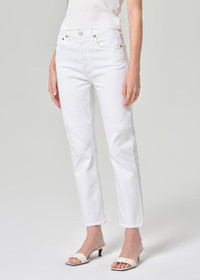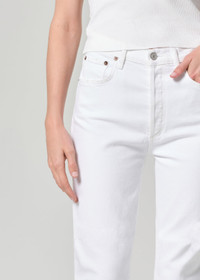 Our signature slim straight leg. With a better-than-vintage aesthetic, the Riley is an iconic brand favorite. The flattering high-rise and straight leg fits close to the body for a universally loved look. Available in stretch and non-stretch denim. This wash is crafted from stretch denim and runs true to size. Looks Like: True crisp white with a finished hem Feels Like: Comfort stretch denim, looks vintage but offers just the right amount of stretch MORE DETAILS Closure: Button Fly Rise: 11 1/2" Inseam: 26" Leg Opening: 14" Model is 5'10" and is wearing a Size 27 Fabric: 98% Cotton 2% Elastane Care Instructions: Machine wash cold inside out with like colors. Do not bleach. Tumble dry low. Made in TUR with imported materials A056D-1085_SCRM