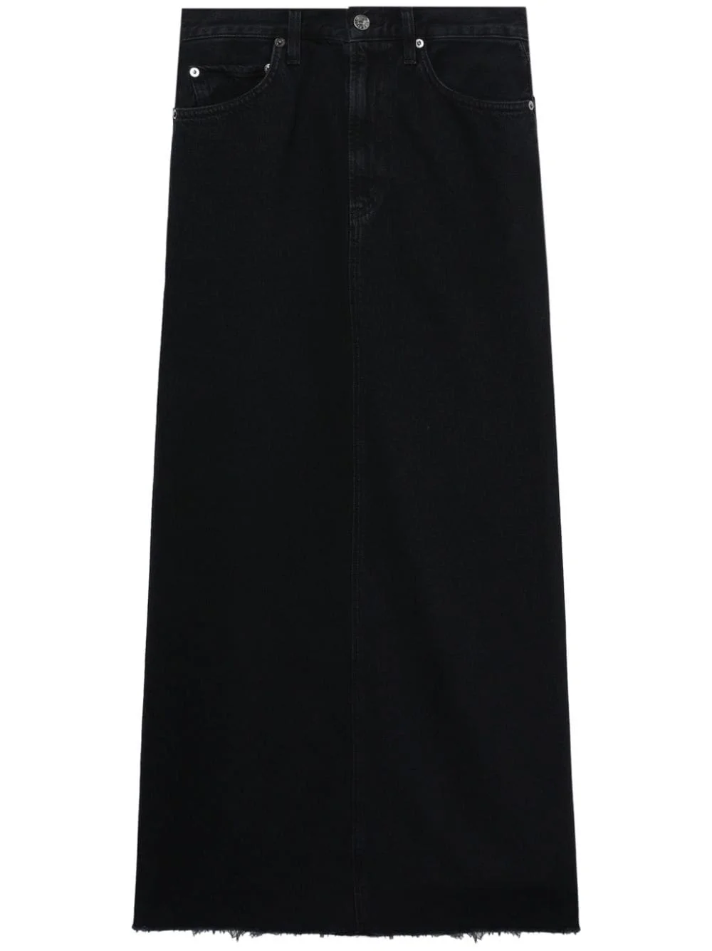 Hilla denim maxi skirt Highlights - Black - Cotton - Denim - Belt loops - Concealed fly and button fastening - Classic five pockets - Rear slit - Ankle-length - Raw-cut hem Made in United States Composition Cotton 100% SIZE & FIT Measurement HIPS 37.79 in(96 cm) WAIST 29.13 in(74 cm) Washing instructions Read Manufacturer Guidelines
