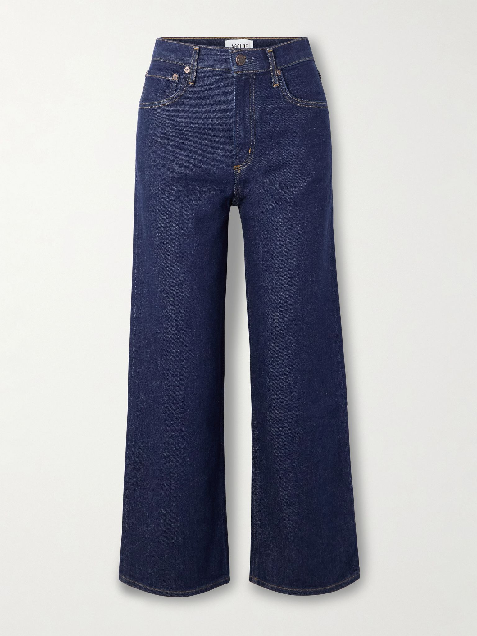 AGOLDE's 'Ren' jeans will soon become your go-to pair for casual days. Made from cotton, they have a high-rise waist and cropped wide legs. Half-tuck a tee into yours. Lower-Impact Materials. This product is made using at least 50% lower-impact materials or ingredients. Find out more about our NET SUSTAIN criteria here. Size & Fit - Fits true to size, however those who are between sizes should take the smaller size - High-rise, cut for a wide-leg fit - Cropped length - Mid-weight, non-stretchy denim - Size 25 jeans have an inside leg of 27"/69cm - Model is 180cm/ 5'11" and is wearing a size 25 Model measurements: - Bust: 86cm/ 34" - Waist: 65cm/ 25.5" - Hip: 90cm/ 35.5" Details & Care - Dark-blue denim - Button and concealed zip fastening at front - 99% regenerative cotton, 1% nylon - Hand wash - This product has been made with regenerative cotton, supporting holistic farming practices that increase soil health, improve biodiversity and reduce carbon emissions