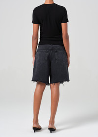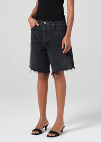 The Indra Short is a season essential, offering a hip-slung fit with a square top block for a relaxed and effortless style. These are AGOLDE’s most eased-up shorts, featuring an upsized fit that combines comfort and casual cool. Crafted from regenerative cotton, these washed-out black denim shorts showcase fading, whiskering, and a raw hem for a lived-in, vintage appeal. Pair with a sleek fitted top and sandals for a laid-back, off-duty look, or style with an oversized shirt and sneakers for an elevated, weekend-ready ensemble. This fit is true to size. Looks Like: Washed out black denim short with fading, whiskering and raw hem Feels Like: Rigid, non stretch cotton denim with a soft hand for all day wearability MORE DETAILS Closure: Button Fly Rise: 12 3/4 Inseam: 9" Leg Opening: 24 1/4" Model is 5'10" and is wearing a Size 27 Fabric: 100% Regenerative Cotton Care Instructions: Machine wash cold inside out with like colors. Do not bleach. Tumble dry low. Made in Turkey with imported materials A222-1157-ONC