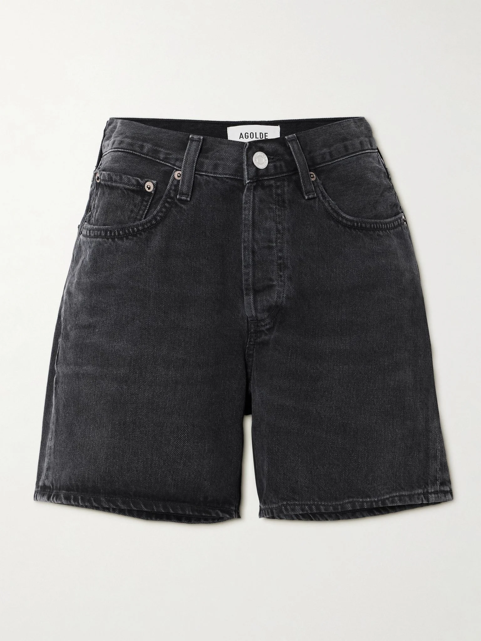 AGOLDE's 'V-Waist' shorts are so-named for the subtle shaped high waist. They're made from denim and faded throughout for a lived-in look. Large to size. See Size & Fit notes. Lower-Impact Materials. This product is made using at least 50% lower-impact materials or ingredients. Find out more about our NET SUSTAIN criteria here. Size & Fit - Fits large to size, take one size smaller than normal - High-rise, cut for a slim fit - Mid-weight, non-stretchy denim - Size 25 jeans have an inside leg of 5"/ 13cm - Model is 175cm/ 5'9", normally wears a size 26 and is wearing a size 25 Model measurements: - Bust: 81cm/ 32" - Waist: 64cm/ 25" - Hip: 89cm/ 35" Details & Care - Black denim - Partially concealed button fastenings along front - 100% regenerative cotton - Machine wash or dry clean - Designer color: Bounce - This product has been made with regenerative cotton, supporting holistic farming practices that increase soil health, improve biodiversity and reduce carbon emissions