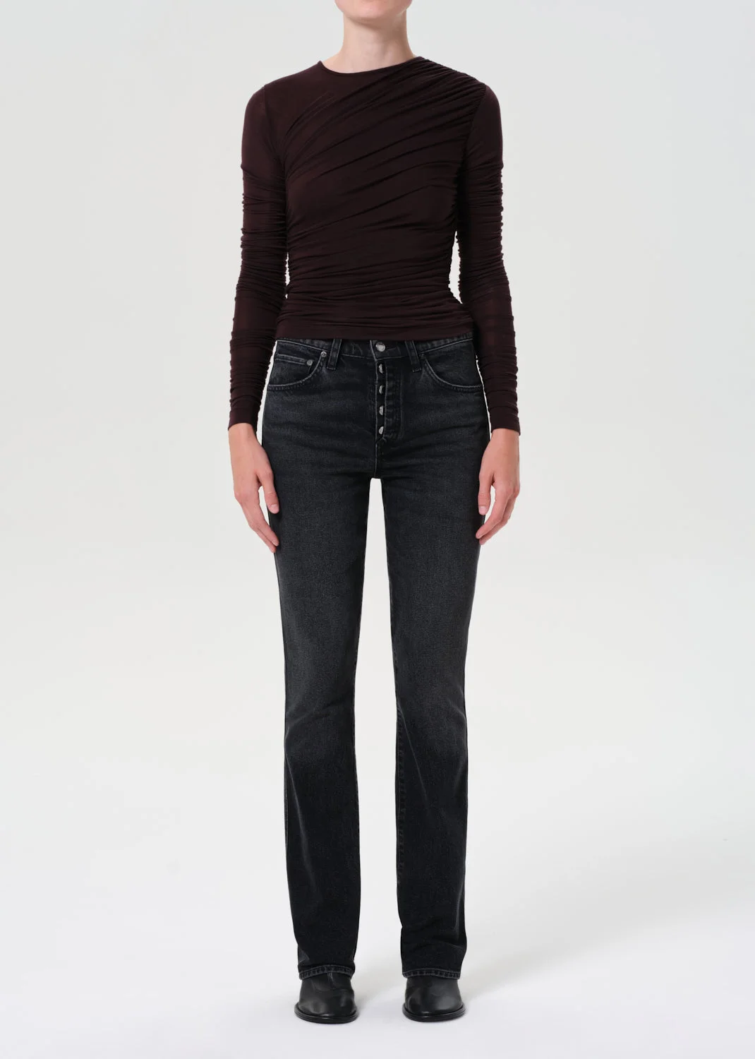 A high-rise skinny with a slim fit and exposed fly. Crafted from soft, comfort-stretch denim, it has a true-to-size fit and a clean, stacked silhouette. In dark vintage black, subtle fading and marbling add texture, making it a modern essential for effortless, elevated styling. This fit is true to size. Looks Like: Dark vintage black denim pant with exposed fly Feels Like: Comfort stretch denim with a super soft hand for all day wearability MORE DETAILS Closure: Button Fly Rise: 10 3/4" Inseam: 33 1/2" Leg Opening: 15 1/4" Model is 5'10" and is wearing a Size 27 Fabric: 98% Cotton, 2% Polyurethane Care Instructions: Machine wash cold inside out with like colors. Do not bleach. Tumble dry low. Made in Turkey with imported materials A296-1026-ATRA