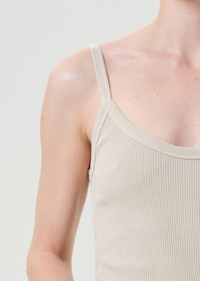 The Jordan Tank is a super subtle V-neck top, crafted from organic cotton and AGOLDE's signature ribbed fabric for a smooth, flattering fit. Its minimalist design makes it a versatile wardrobe essential, perfect for layering or wearing on its own. This fit is true to size. Looks Like: Medium to pale beige thin strap tank top Feels Like: Ultra soft and supportive ribbed cotton MORE DETAILS Body Length: 16" Total Chest: 23" Model is 5'10" and wearing a size Small Fabric: 49% Regenerative Cotton 49% Lyocell 2% Spandex Care Instructions: Machine wash cold. Made in USA with imported materials A7369-1260-CEGSS