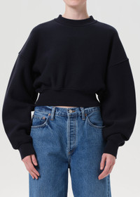 The Kit Sweatshirt is a modern update to the everyday crew, cut in a cropped silhouette with subtle volume and an elasticated hem for a cinched shape. Crafted from breathable cotton fleece with a soft drape, the rich navy hue adds a refined edge. Wear with tonal denim or oversized trousers for a clean, off-duty look. This fit is true to size. Looks Like: Dark navy cropped crewneck sweatshirt with elastic at hem Feels Like: Breathable soft cotton fleece with just the right amount of drape MORE DETAILS Model is 5'10" and wearing a size Small Fabric: 100% Cotton Care Instructions: Machine wash cold. Made in Portugal with imported materials A7348-MRAG