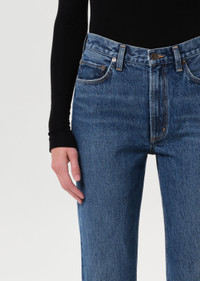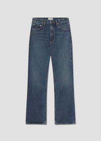 The Leena Jean is a high-rise baby flare with a clean hem and relaxed silhouette. Made from rigid cotton blend denim with subtle fading, marbling, and whiskering, it pairs effortlessly with fitted tops or cropped sweaters. For the petite version, shop the Leena Jean Petite. This fit is true to size. Looks Like: Medium to dark vintage indigo denim pant Feels Like: Rigid, non stretch denim made from a blend of cotton to give a soft hand feel for all day comfort MORE DETAILS Closure: Zipper Fly Rise: 11 3/4" Inseam: 33" Leg Opening: 19" Model is 5'10" and is wearing a Size 27 Fabric: 67% Regenerative Cotton, 22% Lyocell, 11% Post Consumer Recycled Cotton Care Instructions: Machine wash cold inside out with like colors. Do not bleach. Tumble dry low. Made in Turkey with imported materials A218B-1535-PACE
