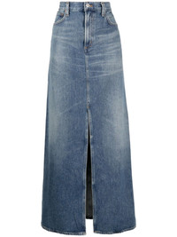 Leif mid-rise denim maxi skirt Highlights - Blue - Recycled cotton-cotton blend - Whiskering effect - Faded effect - Mid-rise - Belt loops - Concealed fly and button fastening - Classic five pockets - Straight hem - Front slit - Ankle-length Made in United States Composition Body: Cotton 80%, Recycled Cotton 20% SIZE & FIT Model measurements Height 5 ft 9 in(1.76 m) Bust/Chest 31.1 in(79 cm) Hips 35.03 in(89 cm) Waist 24.4 in(62 cm) Measurement HIPS 40.15 in(102 cm) LENGTH 38.18 in(97 cm) WAIST 30.7 in(78 cm) FittingInformation This maxi-length skirt is intended to be worn low on the hips Sturdy and hard-wearing, this denim piece offers no stretch This piece fits true to size – take your usual size Washing instructions Machine Wash