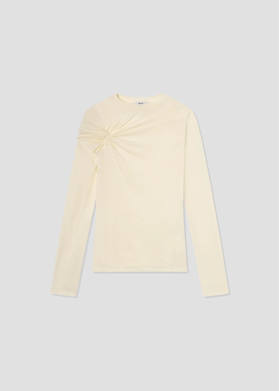 The Lissa Long Sleeve Tee features twist detailing at the shoulder for subtle interest. Made from lightweight baby rib with gentle stretch, it pairs easily with high-rise pants or skirts. Looks Like: Off white, cream long sleeve tee with twist detailing at shoulder Feels Like: Ultra-soft, lightweight fine needle baby rib MORE DETAILS Body Length: 24" Shoulder to Shoulder: 23" Sweep: 28 1/2" Model is 5'10" and wearing a size Small Fabric: 50% Polyester, 32% Cotton, 18% Rayon Care Instructions: Machine wash cold inside out with like colors. Do not bleach. Tumble dry low. Made in USA with imported materials A7407-1618-OATMK