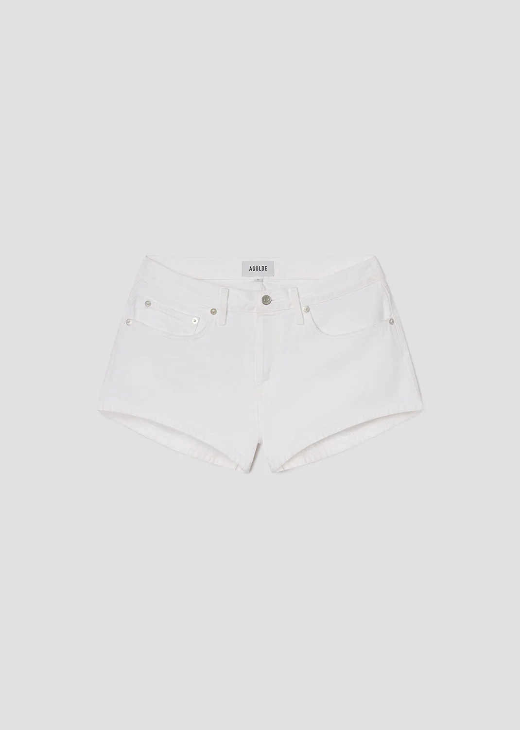A modern take on our best-selling Parker, the Low Rise Parker Short sits loose and low on the hips with a subtly curved hem that creates a more refined, feminine shape. Rendered in a soft clean classic white denim, this pair offers a crisp, bright update to the perfect vintage cut-off silhouette. The relaxed rise and easy drape maintain the effortless appeal of the original, while the updated lines deliver a fresh, flattering fit. Crafted from rigid non stretch 100% regenerative cotton denim with a soft hand feel, these shorts provide structure and all-day wearability while keeping their timeless, authentic look. This fit is true to size. Looks Like: Soft clean classic white denim short Feels Like: Rigid, non stretch cotton denim with a soft hand for all day wearability MORE DETAILS Closure: Button Fly Rise: 9 1/2" Inseam: 2 3/4" Leg Opening: 24 1/4" Model is 5'10" and is wearing a Size 27 Fabric: 100% Regenerative Cotton Care Instructions: Machine wash cold inside out with like colors. Do not bleach. Tumble dry low. Made in Turkey with imported materials A9246-1183-MMELO