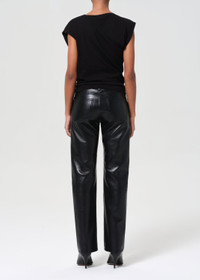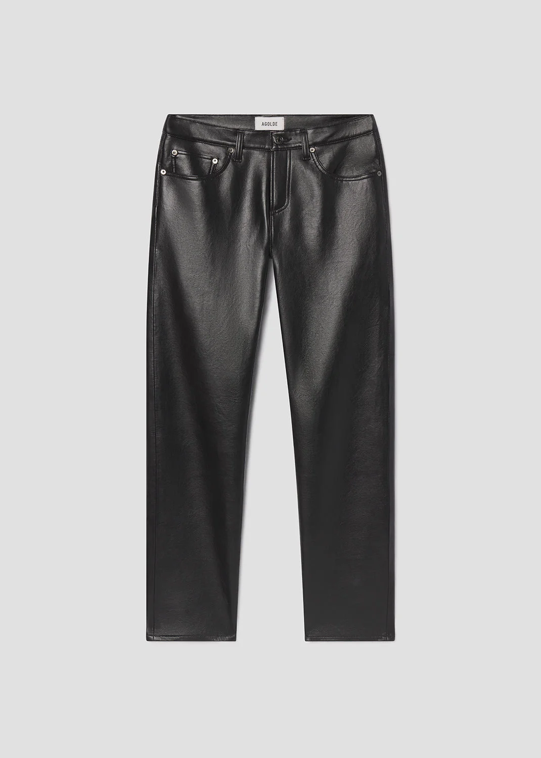 The Recycled Leather Low Rise Slim is crafted from supple matte black leather with a low-rise waist and close, straight leg. Designed with subtle stretch for comfort and ease, this pant pairs effortlessly with oversized knits or structured shirting. This fit is true to size. Looks Like: Luxe black pant with a matte finish Feels Like: Buttery, genuine recycled leather with slight stretch for ease MORE DETAILS Closure: Zipper Fly Rise: 9 1/4" Inseam: 32" Leg Opening: 16 1/2" Model is 5'10" and is wearing a Size 27 Fabric: 50% Recycled Leather, 30% Polyurethane, 10% Viscose, 10% Polyester Care Instructions: Machine wash cold inside out with like colors. Do not bleach. Tumble dry low. Made in Turkey with imported materials A281-1285-DETOX