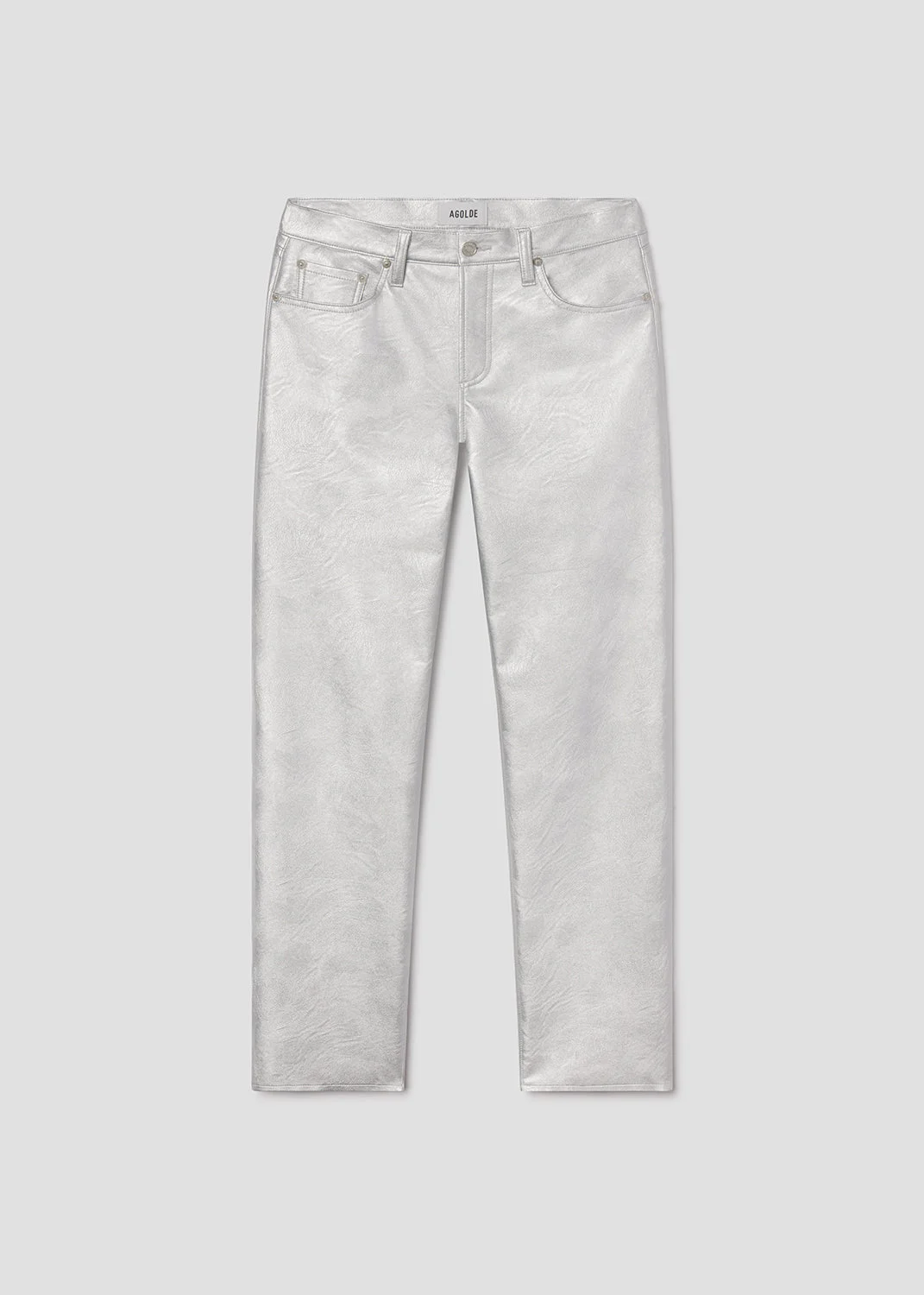 The Low Rise Slim delivers a sleek, close-to-the-body fit that sits low on the waist for a bold, modern silhouette. Designed in a bright metallic silver recycled leather, it brings a striking reflective finish with a clean, sculpted edge. Crafted from buttery recycled leather with a touch of stretch, it molds comfortably to the body while maintaining its smooth, polished shape. Style it with a simple tank for a high-impact look, or pair with a crisp shirt for elevated contrast. This fit is true to size. Looks Like: Bright metallic silver recycled leather pant Feels Like: Buttery, recycled leather with slight stretch for ease MORE DETAILS Closure: Zipper Fly Rise: 9 1/2" Inseam: 32" Leg Opening: 15 3/4" Model is 5'10" and is wearing a Size 27 Fabric: 50% Recycled Leather, 30% Polyurethane, 10% Polyester, 10% Viscose Care Instructions: Dry clean only Made in Turkey with imported materials A281-1908-SIR
