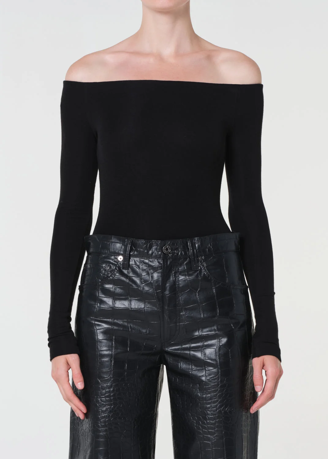 The Maren Bodysuit is a sleek wardrobe staple with a modern off-the-shoulder neckline. Crafted in ultra-soft baby rib, the lightweight long sleeve silhouette is form-fitting and effortless—perfect on its own or as a layering piece. This fit is true to size. Looks Like: True black long sleeve off the shoulder bodysuit Feels Like: Ultra-soft, lightweight fine needle baby rib MORE DETAILS Body Length: 20 1/2" Sleeve Length: 23" Sweep: 25 1/2" Model is 5'10" and wearing a size Small Fabric: 94% Lyocell, 6% Spandex Care Instructions: Machine wash cold inside out with like colors. Do not bleach. Tumble dry low. Made in USA with imported materials A7414-1618-BLK