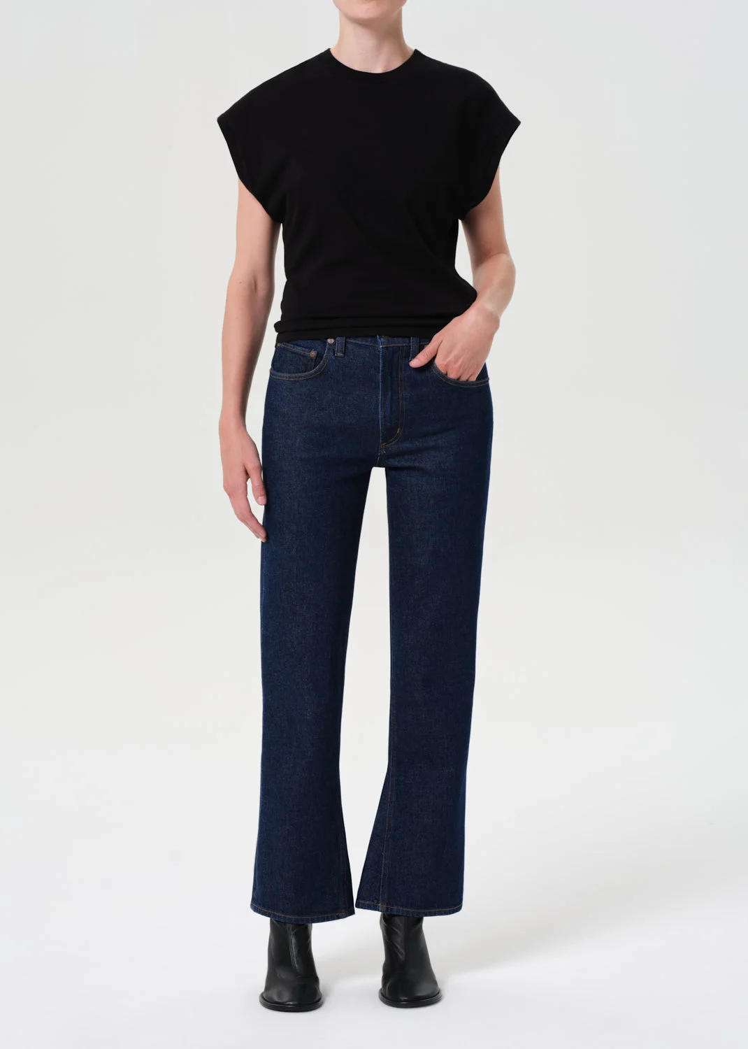 The Kick Boot Ankle is a mid-rise bootcut with an ankle-grazing inseam. Cut in a true rinsed indigo, the comfort-stretch denim offers a soft hand and all-day ease. Its clean finish makes it a versatile staple—ideal with a slim knit or structured blazer. For a longer inseam, shop the Mid Rise Kick Boot. This fit is true to size. Looks Like: True rinsed indigo denim pant Feels Like: Comfort stretch, archive denim with a super soft hand for all day wearability MORE DETAILS Closure: Zipper Fly Rise: 11" Inseam: 29" Leg Opening: 20 3/4" Model is 5'10" and is wearing a Size 27 Fabric: 99% Regenerative Cotton, 1% Elastane Care Instructions: Machine wash cold inside out with like colors. Do not bleach. Tumble dry low. Made in Turkey with imported materials A293-1854-RESS
