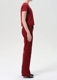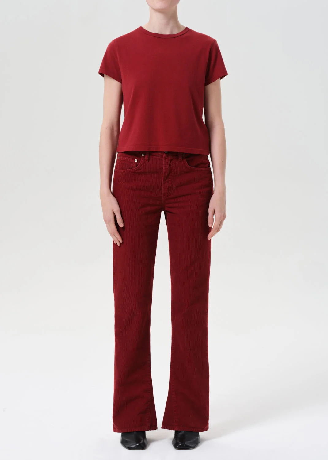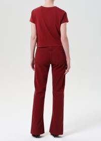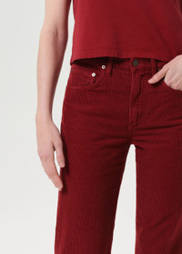 A vintage-inspired silhouette reimagined in plush, velvety corduroy. The Kick Boot sits at the mid waist with a slim fit through the thigh before subtly flaring at the ankle—an effortless nod to retro tailoring. Crafted from a rich, dark red cotton cord with a super soft hand feel. Pair with a sleek turtleneck or go monochromatic with a tonal tee. This fit is true to size. Looks Like: Dark clean red corduroy pant Feels Like: Super soft and luxe vintage corduroy MORE DETAILS Closure: Zipper Fly Rise: 11" Inseam: 33" Leg Opening: 20 3/4" Model is 5'10" and is wearing a Size 27 Fabric: 100% Cotton Care Instructions: Machine wash cold inside out with like colors. Do not bleach. Tumble dry low. Made in Turkey with imported materials A277-1832-RIK