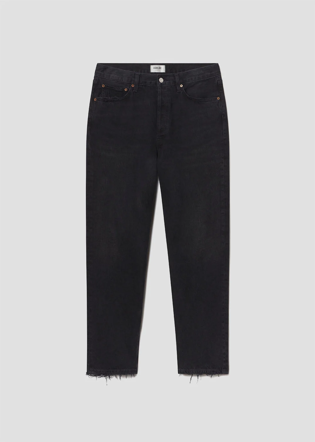 Cue the nostalgia. This 90's-inspired fit is crafted from black denim and regenerative cotton. With a relaxed mid-rise, eased fit through the hips, and loose, straight leg, these jeans offer a timeless silhouette. Pair with an airy top and sandals for an effortless, relaxed look. For the shorter inseam, shop the 90's Crop. This fit is intended to be relaxed. Size down for a higher, closer fit. Looks Like: Medium indigo denim with subtle distressing and marbling detailing Feels Like: Rigid, non stretch cotton denim with a soft hand for all day wearability MORE DETAILS Closure: Button Fly Rise: 12 3/4" Inseam: 29" Leg Opening: 16" Model is 5'10" and is wearing a Size 27 Fabric: 100% Organic Cotton Care Instructions: Machine wash cold inside out with like colors. Do not bleach. Tumble dry low. Made in TUR with imported materials A069E-1157_TAR