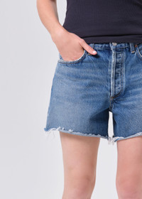 Our most relaxed short, the Nye is designed with a loose, low-slung fit and a subtle drop crotch for a true borrowed-from-the-boys feel. Rendered in a medium classic washed indigo, it features raw hems and generous five-pocket detailing, giving it an easy, authentically vintage attitude. Meant to be worn low on the hips, this silhouette delivers a laid-back, effortlessly cool look every time. Crafted from rigid non stretch 100% regenerative cotton denim with a soft hand feel, it offers all-day wearability while maintaining its crisp, structured shape. This fit is true to size. Looks Like: Medium classic washed indigo denim short Feels Like: Rigid, non stretch cotton denim with a soft hand for all day wearability MORE DETAILS Closure: Button Fly Rise: 12" Inseam: 4 3/4" Leg Opening: 25 1/2" Model is 5'10" and is wearing a Size 27 Fabric: 100% Regenerative Cotton Care Instructions: Machine wash cold inside out with like colors. Do not bleach. Tumble dry low. Made in Turkey with imported materials A9249-1810-UNTY