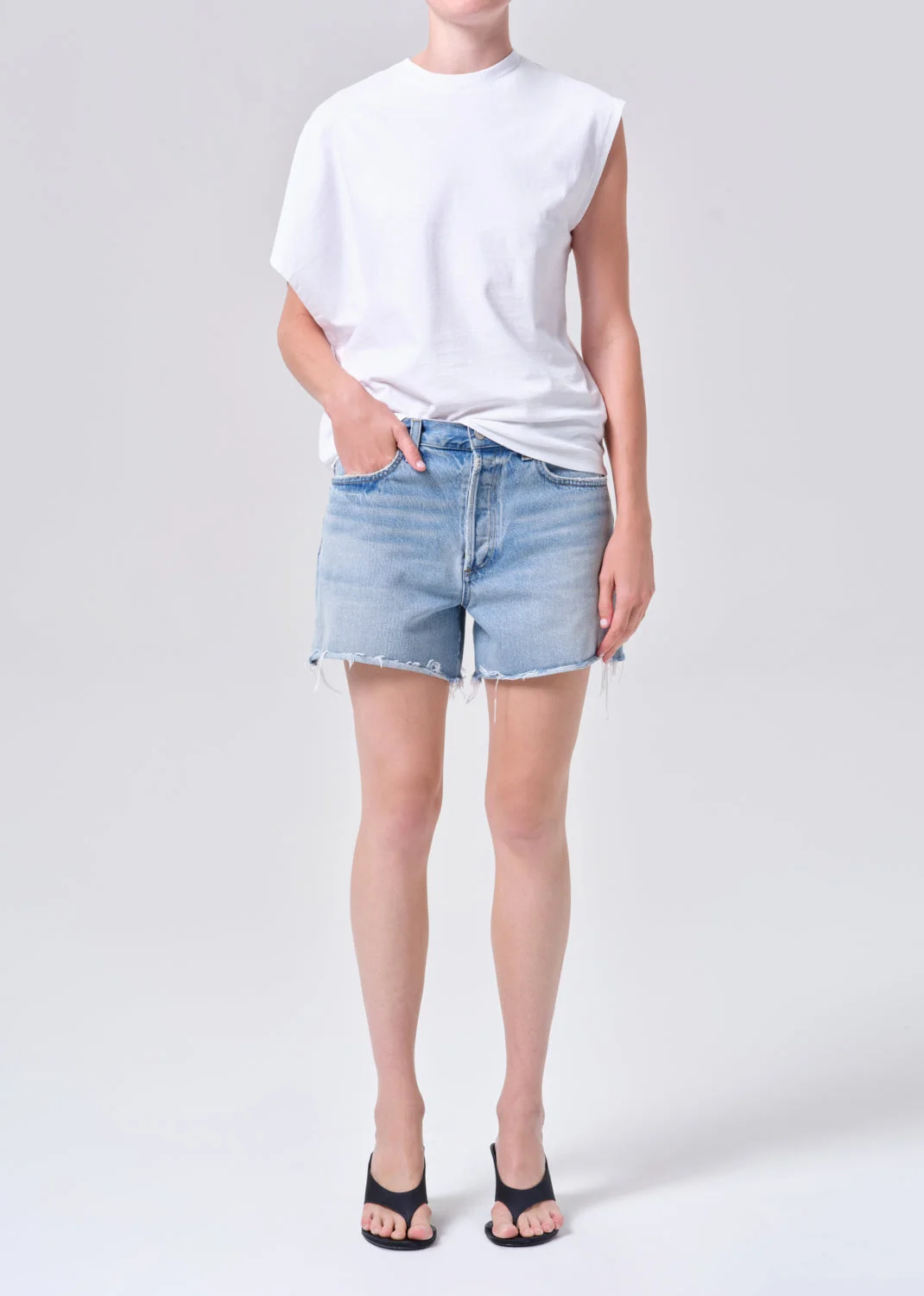 Our most relaxed short, the Nye is designed with a loose, low-slung fit and a subtle drop crotch for an authentic borrowed-from-the-boys feel. Rendered in a light vintage indigo wash, it offers a sun-faded, lived-in look that enhances its easy, undone attitude. With raw hems and generous five-pocket detailing, this style is meant to be worn low on the hips for a laid-back, effortlessly cool silhouette. Crafted from rigid non stretch 100% regenerative cotton denim with a soft hand feel, it provides structure with all-day comfort and wearability. This fit is true to size. Looks Like: Light vintage indigo denim short Feels Like: Rigid, non stretch cotton denim with a soft hand for all day wearability MORE DETAILS Closure: Button Fly Rise: 12" Inseam: 4 3/4" Leg Opening: 25 1/2" Model is 5'10" and is wearing a Size 27 Fabric: 100% Regenerative Cotton Care Instructions: Machine wash cold inside out with like colors. Do not bleach. Tumble dry low. Made in Turkey with imported materials A9249-1371-POST