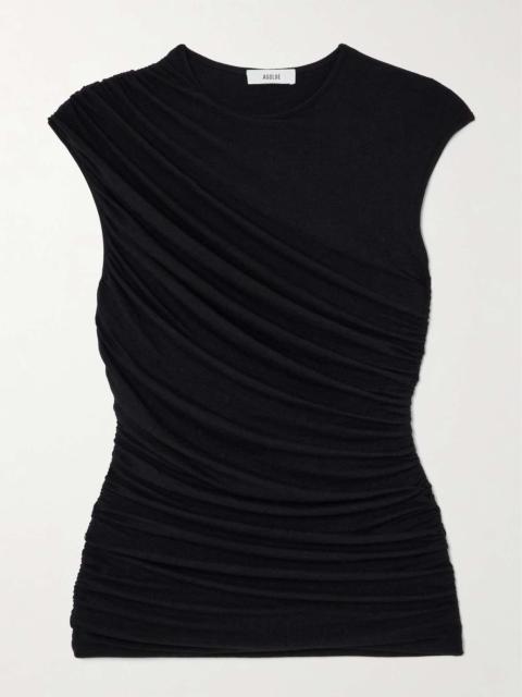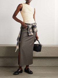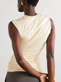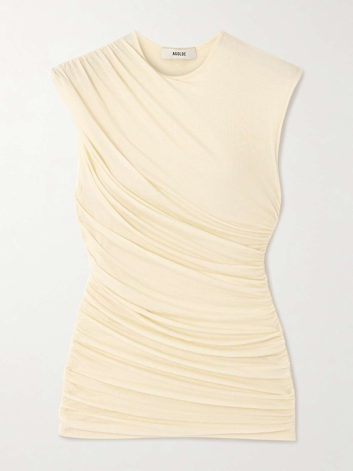 EDITORS'NOTES AGOLDE's 'Ester' tank top is ruched at the shoulder and side seams to create a beautiful drape. It's made from stretch-TENCEL™ Lyocell jersey for a close fit and has a high neckline. Lower-Impact Materials. This product is made using at least 50% lower-impact materials or ingredients. Find out more about our NET SUSTAIN criteria here. SIZE & FIT Model measurements: - Fits true to size, take your normal size - Designed for a close fit - Mid-weight, stretchy fabric - Model is 177cm/ 5'10" and is wearing a size Small - Bust: 79cm/ 31" - Waist: 61cm/ 24" - Hip: 89cm/ 35" DETAILS & CARE - Beige stretch-TENCEL™ Lyocell jersey - Slips on - 94% TENCEL™ Lyocell, 6% spandex - Hand wash - Designer color: Oat Milk