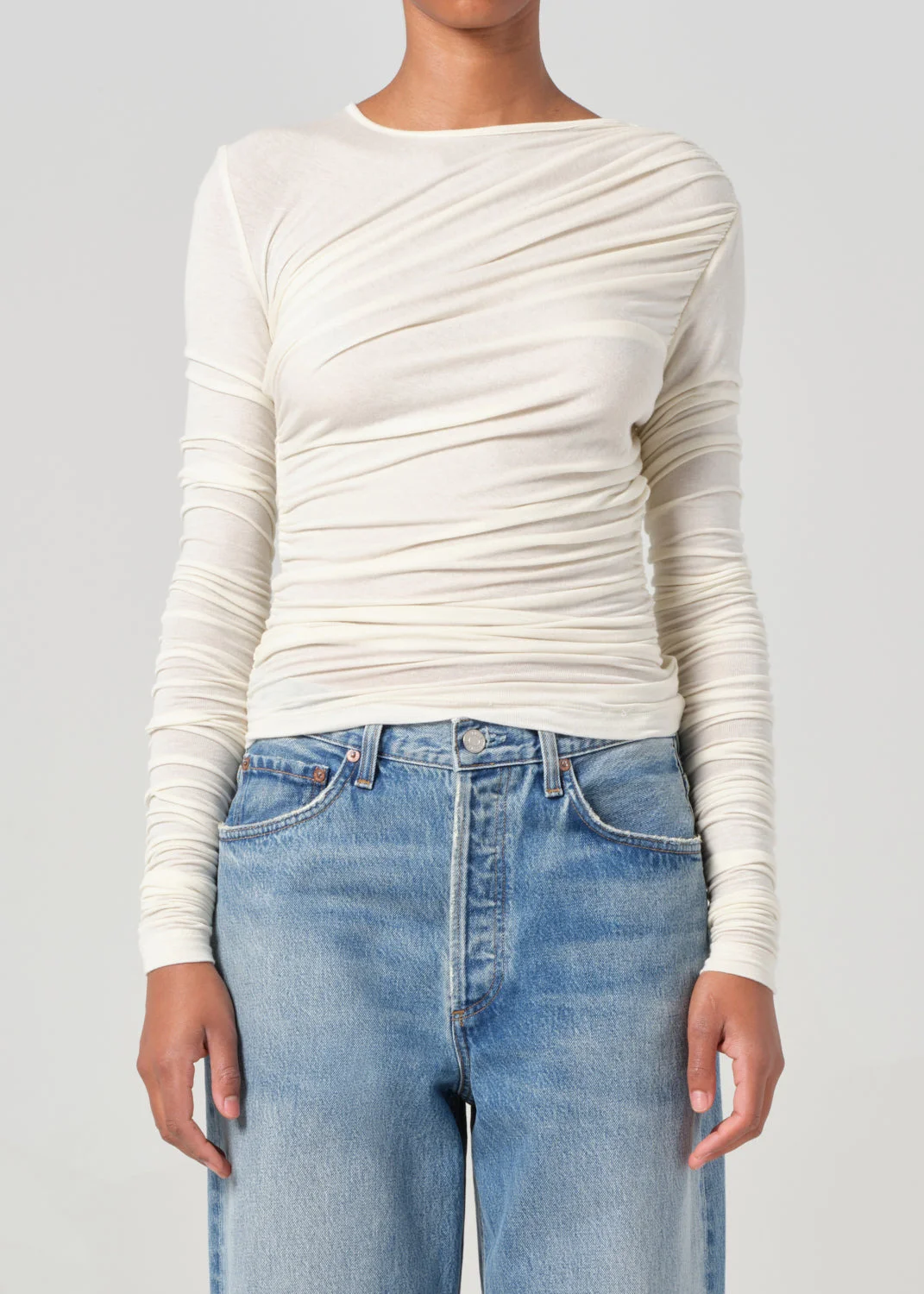 The Tania features beautifully layered diagonal rouching, highlighting texture and form. Crafted from an ultra-fine, soft-stretch fabric. this slightly-sheer top is designed with a slim fit. This fit runs true to size. Looks Like: Cream, off white long sleeve with twist detailing Feels Like: Ultra-soft, lightweight fine needle baby rib MORE DETAILS Body Length: 19 1/2" Chest: 25 1/2" Sweep: 27" Shoulder to Shoulder: 12" Sleeve Length: 26" Model is 5'10" and wearing a size Small Fabric: 94% Tencel, 6% Spandex Care Instructions: Machine wash cold inside out with like colors. Do not bleach. Tumble dry low. Made in USA with imported materials A7317-1618_OATMK