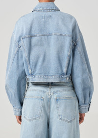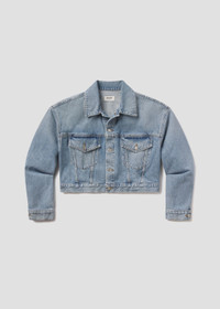 An updated take on a classic, the Palmer in light indigo from the Weightless Collection offers a relaxed, effortless vibe. Crafted from regenerative cotton, it features a subtle cropped body with low, exaggerated balloon sleeves for a modern twist. The lightweight feel of the fabric makes it perfect for layering throughout the seasons, while the light indigo wash adds a soft, lived-in appeal. A versatile piece that easily transitions from casual days to elevated looks. This fit is true to size. Looks Like: Light indigo denim jacket with marbling Feels Like: Weightless, non stretch denim cotton with a soft finish MORE DETAILS Body Length: 20 1/2 1/2" Shoulder to Shoulder: 22 1/4" Sleeve Length: 22" Model is 5'10" and wearing a size Small Fabric: 100% Regenerative Cotton Care Instructions: Machine wash cold inside out with like colors. Do not bleach. Tumble dry low. Made in Turkey with imported materials A5047-1601-SPC