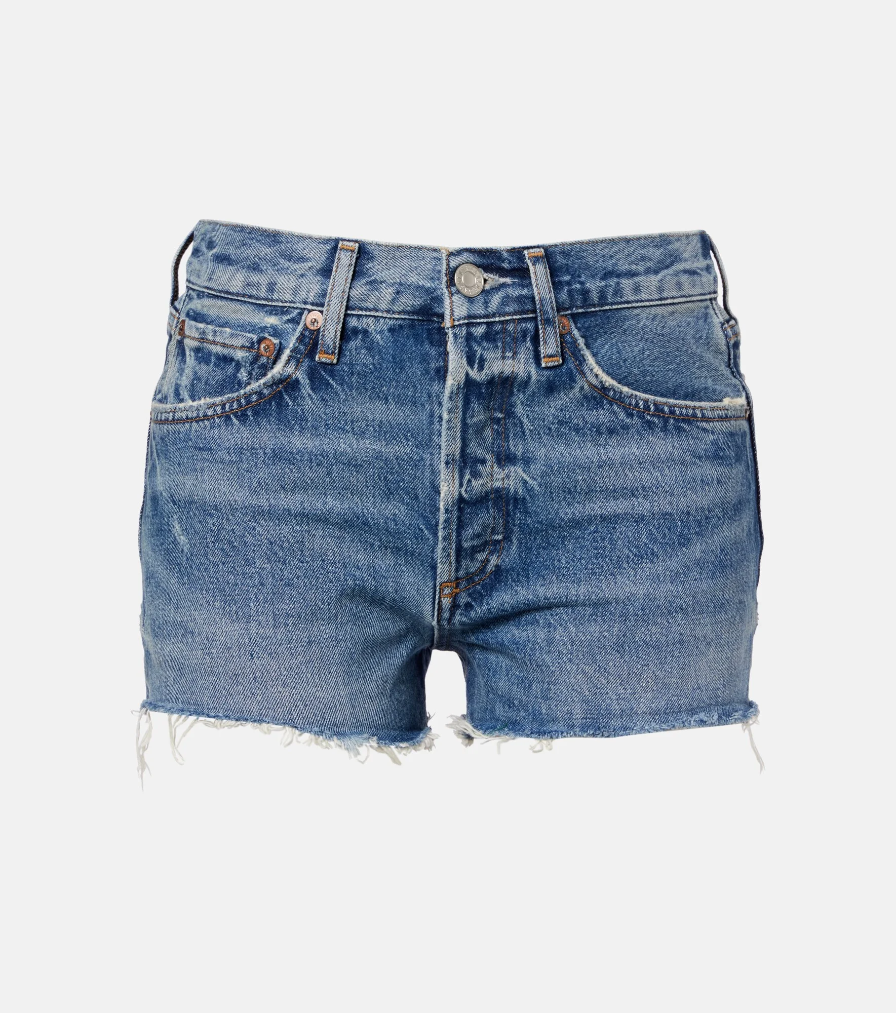 Setting the standard for modern denim, all of Agolde's designs are fit-tested and crafted from premium fabric. The Parker shorts have a mid-rise waistline and distressed raw hems. Product Details - Material: 100% cotton - Care instructions: machine wash cold - Made in Turkey - Color: blue - Designer color name: Chorus - Closure: concealed button placket - Pockets: five pockets - Item number: P01184249 Size & Fit - True to size - Non-stretchy fabric - Straight leg - Mid-rise - The model seen in the picture is 178cm-5'10" and wearing a size 27