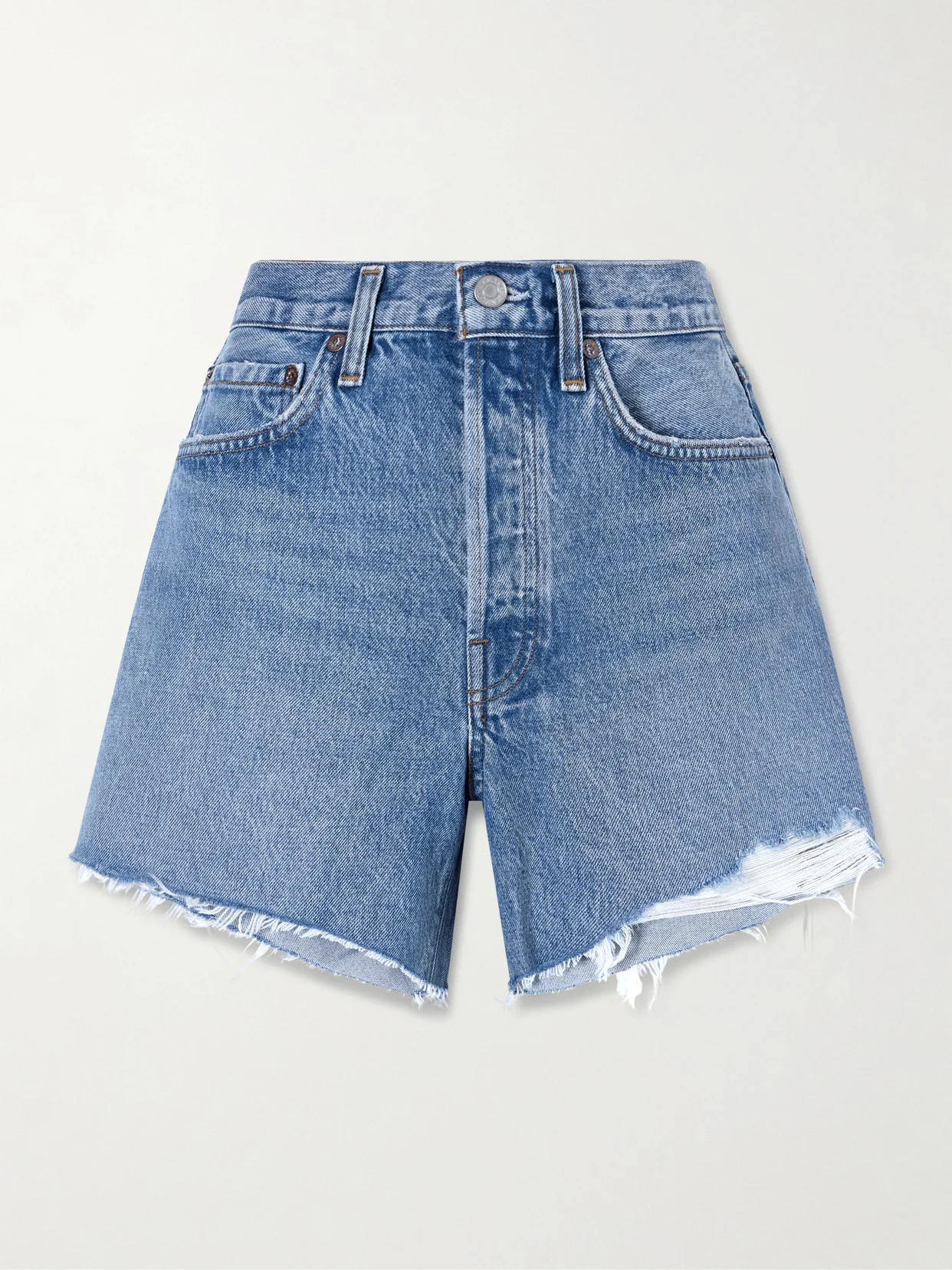 Denim shorts are a summer essential. Made from cotton, AGOLDE's 'Parker' shorts are subtly distressed for a lived-in, grunge-inspired feel. Style them with a chunky belt. Lower-Impact Materials. This product is made using at least 50% lower-impact materials or ingredients. Find out more about our NET SUSTAIN criteria here.