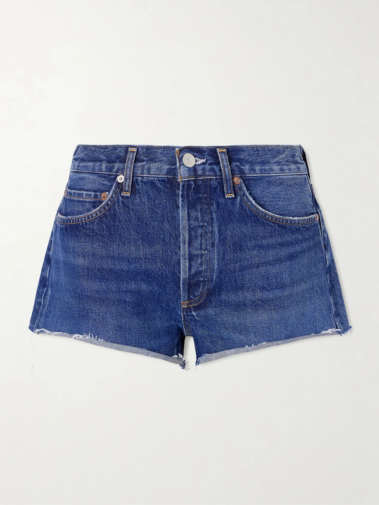 A warm-weather essential, the 'Parker' shorts by AGOLDE reflect the label's vintage-inspired approach to casual dressing. Crafted from mid-wash denim, they have a mid-rise waist and classic five-pocket construction. Subtle fading and a frayed hem lend the relaxed silhouette a lived-in feel. Lower-Impact Materials. This product is made using at least 50% lower-impact materials or ingredients. Find out more about our NET SUSTAIN criteria here.