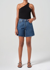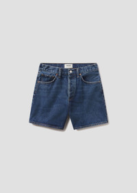 The Dame Short is crafted from regenerative cotton in dark vintage indigo denim, offering a rich, timeless look. With a high-rise fit, relaxed silhouette, and wide leg opening, these shorts offer the perfect blend of ease and style. The clean hem adds a crisp finish, making them perfect for pairing with a simple tank or oversized shirt for an effortlessly elevated summer outfit. This fit is true to size. Looks Like: Dark vintage indigo denim short with clean hem Feels Like: Rigid, non stretch cotton denim with an authentic vintage hand MORE DETAILS Closure: Button Fly Rise: 12" Inseam: 6" Leg Opening: 25 1/2" Model is 5'10" and is wearing a Size 27 Fabric: 100% Regenerative Cotton Care Instructions: Machine wash cold inside out with like colors. Do not bleach. Tumble dry low. Made in Turkey with imported materials A221-1371-ENMR