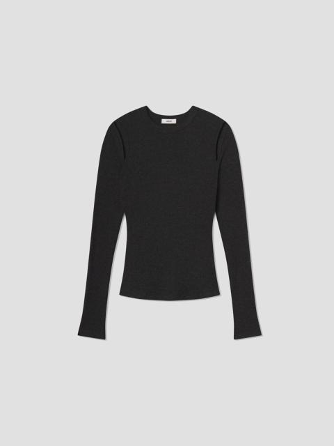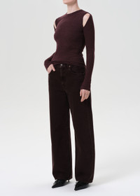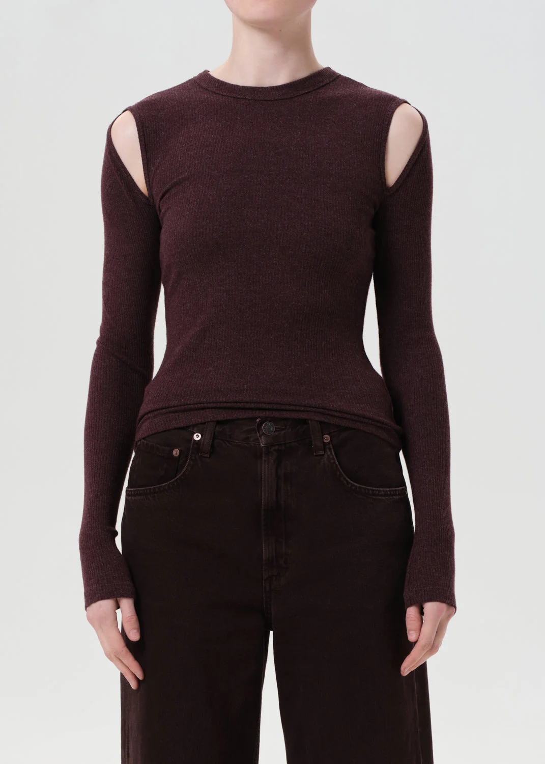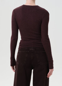 The Pierce Tee is a long sleeve, body-hugging silhouette with shoulder cutouts for a subtle edge. Wear it tucked into high-rise denim or layered under a jacket. This fit is true to size. Looks Like: Dark brown and burgundy long sleeve tee with cut outs at the shoulder Feels Like: Midweight intermingle chunky rib that hugs the body MORE DETAILS Body Length: 24 3/4" Shoulder to Shoulder: 13 1/2" Sleeve Length: 26 1/8" Model is 5'10" and wearing a size Small Fabric: 50% Polyester, 32% Cotton, 18% Rayon Care Instructions: Machine wash cold. Made in USA with imported materials A7386-1352-RIS