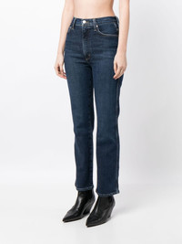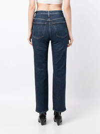 high-rise flared jeans Highlights - Indigo blue - Organic cotton blend - Denim - Whiskering effect - Contrast stitching - Belt loops - Concealed fly and button fastening - High-waisted - Flared - Classic five pockets - Straight hem Imported Composition Organic Cotton 59%, Ecovero 40%, Elastane 1% SIZE & FIT Model measurements Height 5 ft 10 in(1.79 m) Bust/Chest 31.49 in(80 cm) Hips 34.64 in(88 cm) Waist 22.83 in(58 cm) Measurement FRONT RISE 11.41 in(29 cm) INSIDE LEG 29.92 in(76 cm) HIPS 33.85 in(86 cm) WAIST 24.4 in(62 cm) FittingInformation Designed with a flared hem, these jeans allow for a close fit at the waist with a slim fit over the leg and widening towards the hem Constructed from stretch denim, this piece offers a stretch fit with durability This piece fits true to size – take your usual size Washing instructions Machine Wash