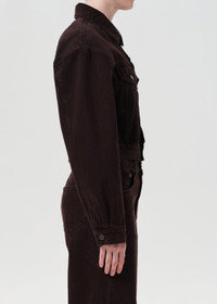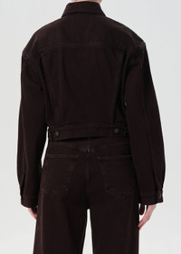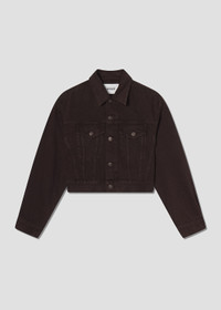 The Radley Jacket is a cropped, structured take on the classic denim trucker. Rendered in a rich grape hue with subtle brown undertones, this rigid, non-stretch denim style is finished with a defined waist and button front closure. Complete the look with tonal denim or layer over a neutral base. This fit is true to size. Looks Like: Dark grape colored denim jacket with brown undertones Feels Like: Rigid, non stretch cotton denim with a soft hand for all day wearability MORE DETAILS Body Length: 20" Shoulder to Shoulder: 20 5/8" Chest: 38" Sweep: 34" Sleeve Length: 23 1/4" Model is 5'10" and wearing a size Small Fabric: 100% Regenerative Cotton Care Instructions: Machine wash cold inside out with like colors. Do not bleach. Tumble dry low. Made in Turkey with imported materials A5106C-1183-SLBRR