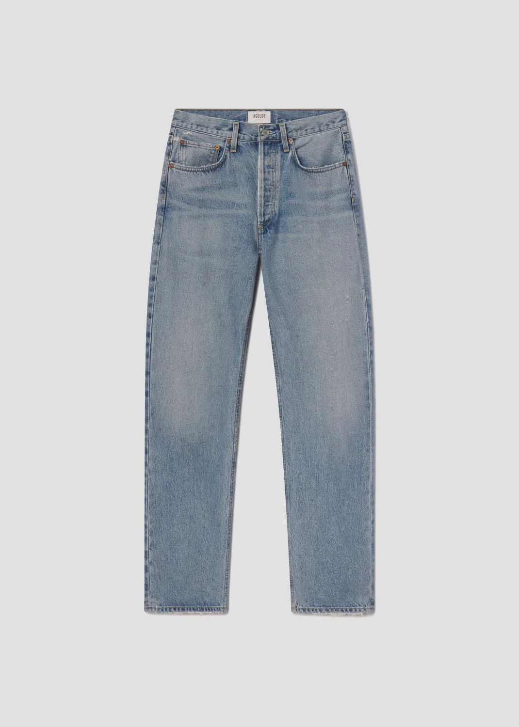 The Kelly features a flattering high-rise waist that leads into a relaxed top block, falling into a classic straight leg with a vintage-inspired extended inseam. Crafted from 100% regenerative cotton in medium vintage indigo, the jeans showcase natural fading, whiskering, and subtle marbling for a perfectly worn-in look. With a non-stretch construction, they offer a timeless, authentic feel. Style them with a sleek bodysuit and ankle boots for a polished look, or pair with a relaxed tee and sneakers for an effortless off-duty vibe. This fit is true to size. Looks Like: Medium vintage indigo with fading, whiskering and marbling Feels Like: Rigid, non stretch cotton denim with a soft hand for all day wearability MORE DETAILS Closure: Button Fly Rise: 11 1/4" Inseam: 32" Leg Opening: 17" Model is 5'10" and is wearing a Size 27 Fabric: 100% Regenerative Cotton Care Instructions: Machine wash cold inside out with like colors. Do not bleach. Tumble dry low. Made in Turkey with imported materials A199-1206-HRNC