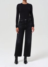 AGOLDE's Ren jeans from the Weightless Collection offer the perfect blend of comfort and style. Made from regenerative cotton, they feature a high-rise waist and cropped wide legs for a relaxed yet flattering silhouette. The lightweight fabric ensures all-day comfort, making them ideal for casual wear. Pair them with a half-tucked tee for a cool, effortless look. This fit is true to size. For a shorter inseam, shop the Ren Jean Petite 25" Looks Like: Deep washed black denim with fading and whiskering Feels Like: Weightless stretch cotton denim that will hold its shape while hugging the body MORE DETAILS Closure: Zipper Fly Rise: 12 1/4" Inseam: 27 1/2" Leg Opening: 19 1/2" Model is 5'10" and is wearing a Size 27 Fabric: 96% Organic Cotton, 3% Polyester, 1% Elastane Care Instructions: Machine wash cold inside out with like colors. Do not bleach. Tumble dry low. Made in Turkey with imported materials A200-1274-HSH