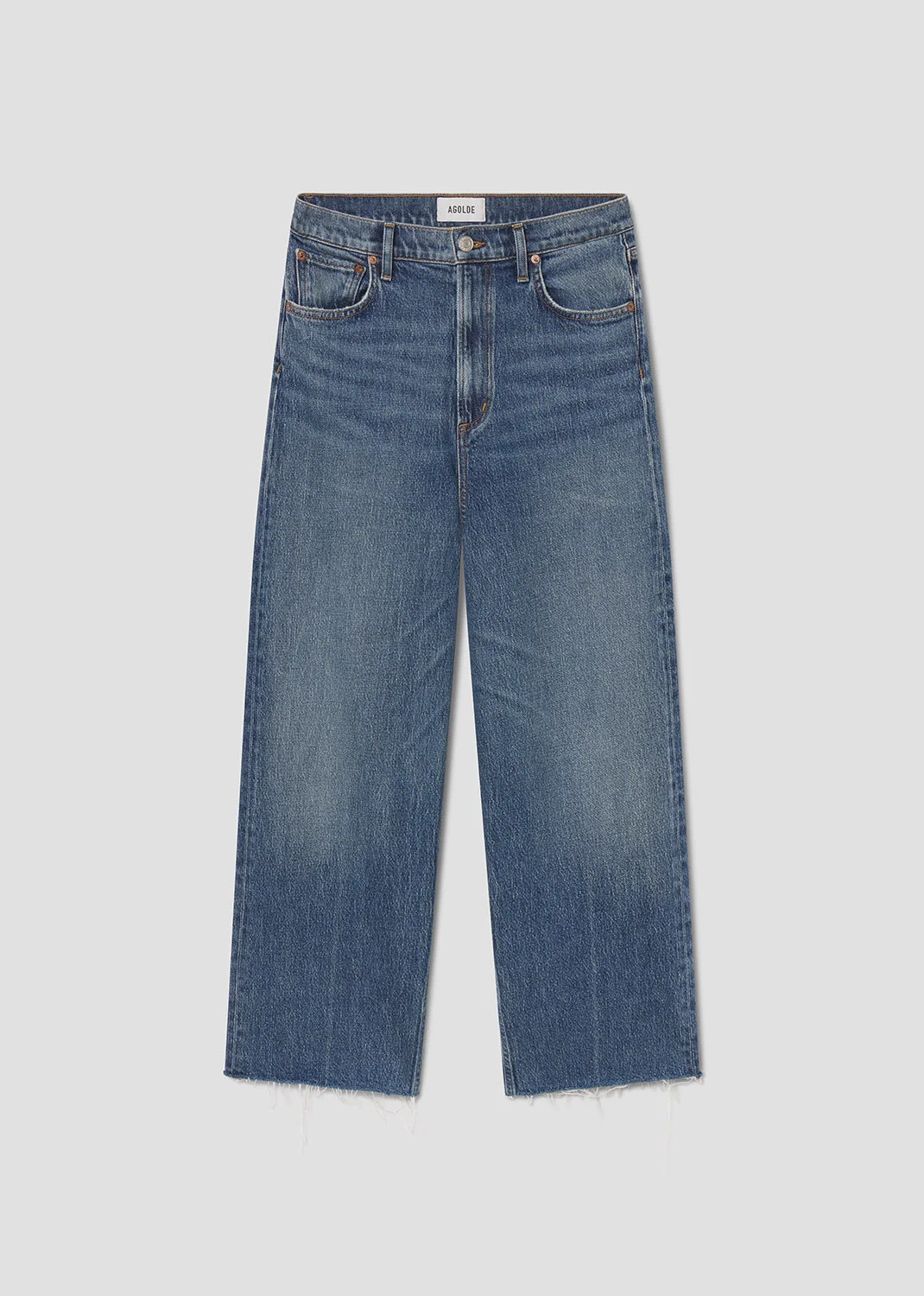 AGOLDE's Ren Jean from the Weightless Collection offer the perfect blend of comfort and style. Made from regenerative cotton, they feature a high-rise waist and cropped wide legs for a relaxed yet flattering silhouette. The lightweight fabric ensures all-day comfort, making them ideal for casual wear. Pair them with a half-tucked tee for a cool, effortless look. This fit is true to size. For a shorter inseam, shop the Ren Jean Petite 25" Looks Like: Medium vintage indigo denim pant Feels Like: Comfort stretch, archive denim with a super soft hand for all day wearability MORE DETAILS Closure: Zipper Fly Rise: 12 1/4" Inseam: 27 1/2" Leg Opening: 19 1/2" Model is 5'10" and is wearing a Size 27 Fabric: 99% Regenerative Cotton, 1% Elastane Care Instructions: Machine wash cold inside out with like colors. Do not bleach. Tumble dry low. Made in Turkey with imported materials A200E-1554-CHRD