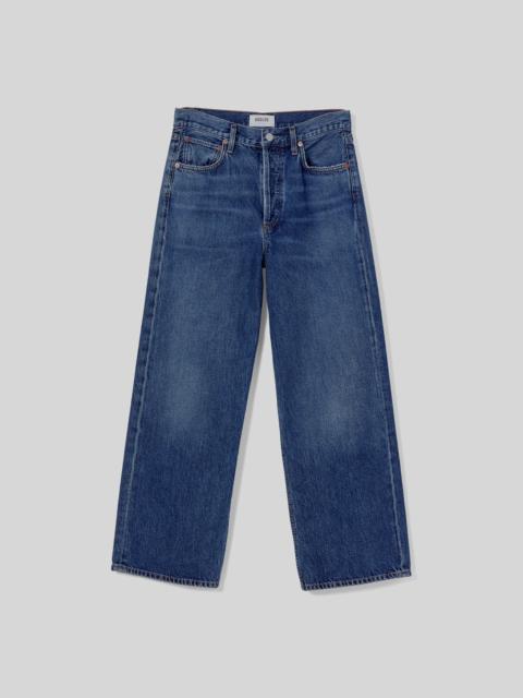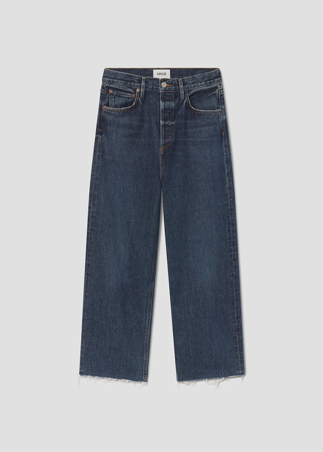 AGOLDE’s Ren Jean features a dark tinted indigo in a classic wide-leg silhouette. Made from 100% weightless, non-stretch denim with a super soft hand, these high-rise jeans offer a relaxed yet flattering fit with subtle fading, marbling, and whiskering details. Pair with a simple tee or structured jacket for effortless style. This fit is true to size. For a shorter inseam, shop the Ren Jean Petite 25" Looks Like: Dark tinted indigo denim pant Feels Like: Non stretch, weightless denim washed down for a soft to the touch feel MORE DETAILS Closure: Button Fly Rise: 12 1/4" Inseam: 27 1/2" Leg Opening: 19 1/2" Model is 5'10" and is wearing a Size 27 Fabric: 100% Regenerative Cotton Care Instructions: Machine wash cold inside out with like colors. Do not bleach. Tumble dry low. Made in Turkey with imported materials A9191-1601-XUS