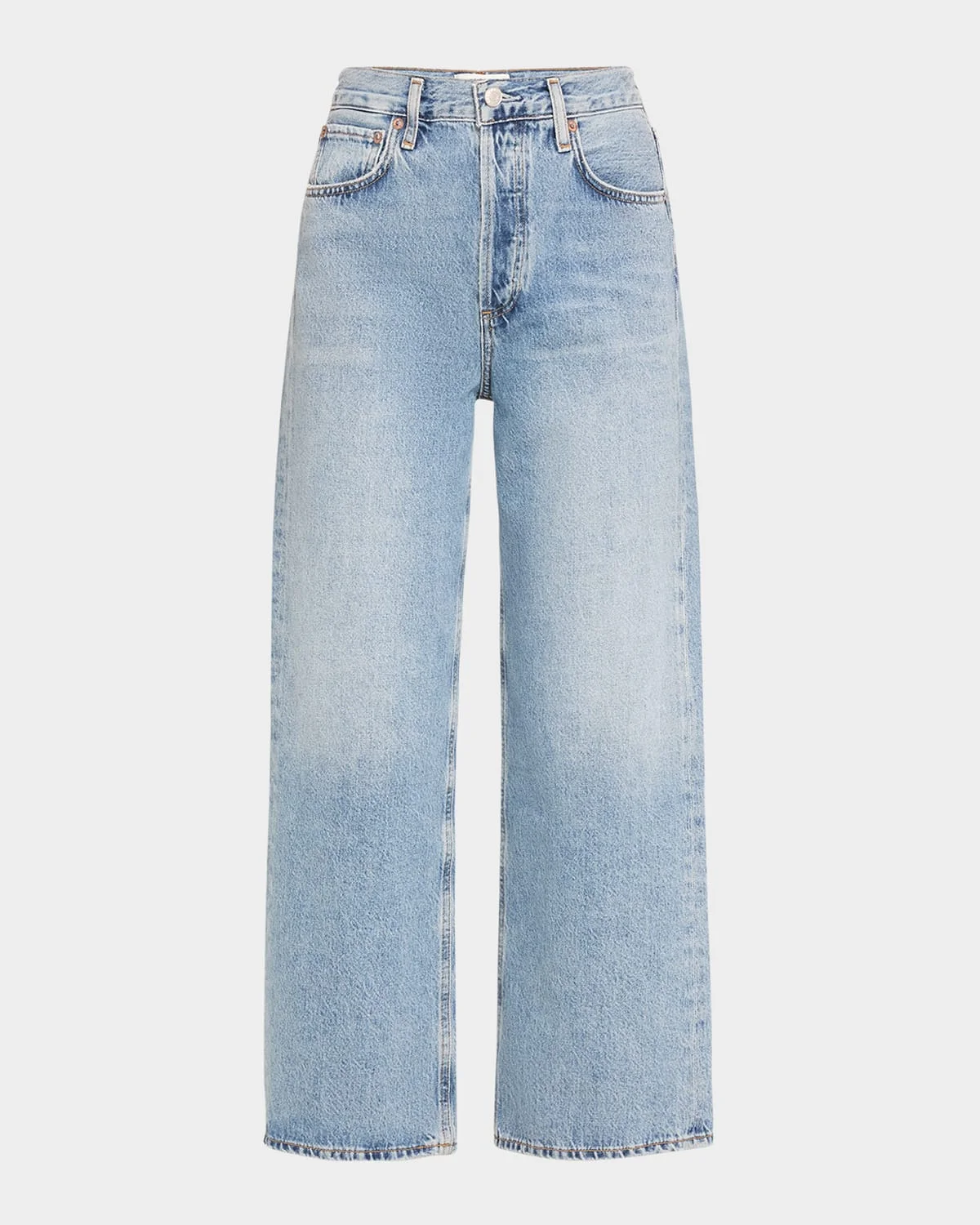 AGOLDE "Ren" wideleg jeans in lightwash denim High rise Fivepocket style Loose fit Cropped length Button/zip fly; belt loops Cotton Imported