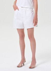 The Rhoda Short features a relaxed fit with a high-rise waist and a feminine A-line silhouette. Pleat detailing adds subtle texture, while the clean, refined hem gives the shorts a polished, sophisticated finish. Style them with a tucked-in blouse and sandals for a breezy summer look. This fit is true to size. Looks Like: Vintage light indigo denim short with pleat front detailing Feels Like: Rigid, non stretch cotton denim with a soft hand for all day wearability MORE DETAILS Closure: Button Fly Rise: 13 1/4" Inseam: 4 1/2" Leg Opening: 27 1/2" Model is 5'10" and is wearing a Size 27 Fabric: 100% Regenerative Cotton Care Instructions: Machine wash cold inside out with like colors. Do not bleach. Tumble dry low. Made in USA with imported materials A9240B-1183-MSHAK