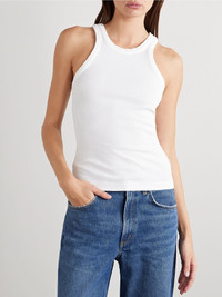 AGOLDE's 'Rayne' tank will serve as the starting point for so many outfits. Made from ribbed stretch organic cotton and Lyocell-blend jersey, it's cut for a slim fit and has a high crew neckline. Wear it alone or as a base layer. Size & Fit - Fits true to size, take your normal size - Cut for a slim fit - Mid-weight, stretchy fabric - Model is 180cm/ 5’11” and is wearing a size XSmall Model measurements: - Bust: 81cm/ 32” - Waist: 62cm/ 24.5” - Hip: 88cm/ 34.5” Details & Care - White stretch organic cotton and Lyocell-blend jersey - Slips on - 49% organic cotton, 49% Lyocell, 2% spandex - Machine wash