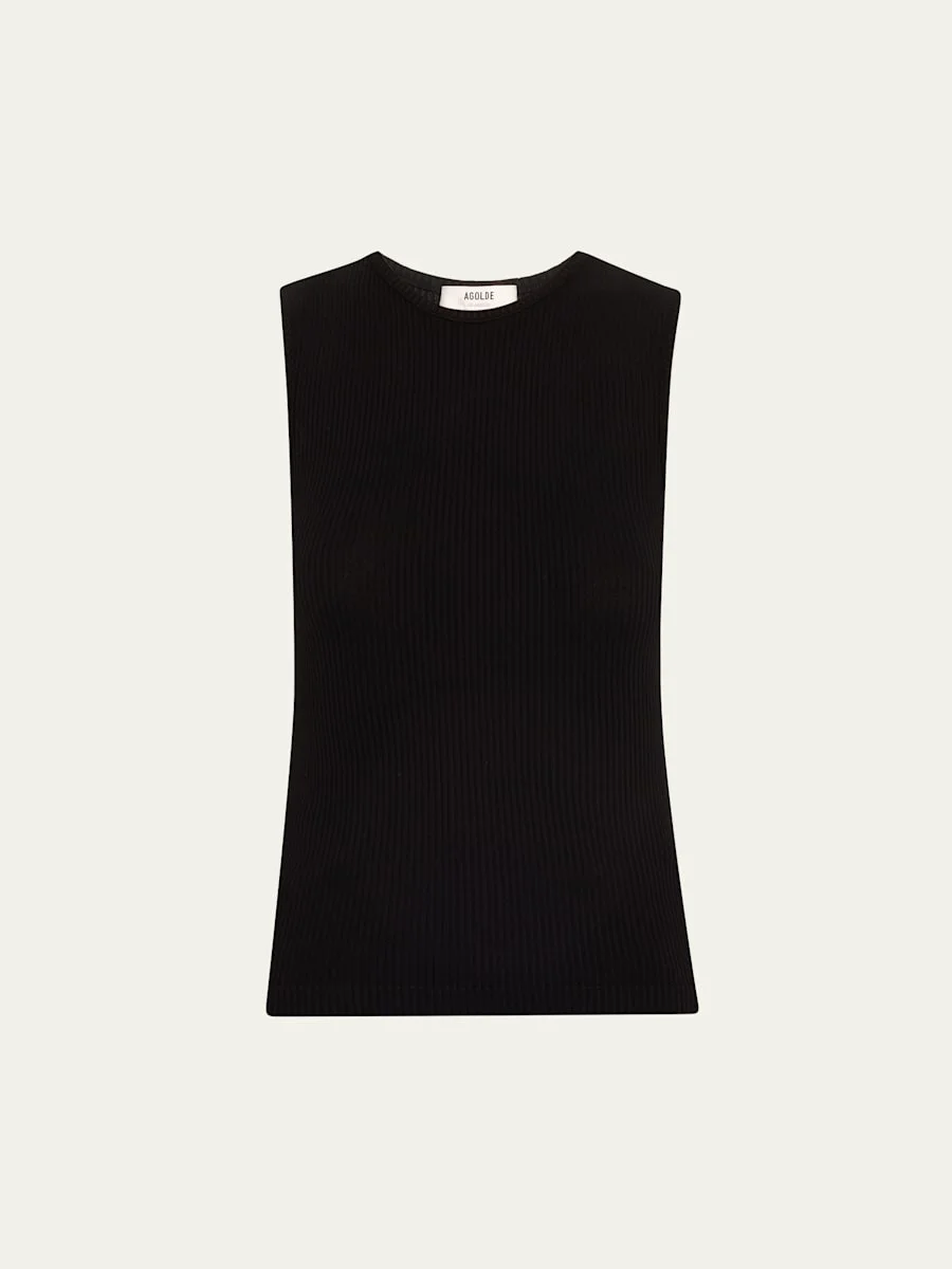 Designed with a high neckline and a ribbed texture that enhances the close fit. AGOLDE "Binx" ribbed-knit tank top Crew neckline Sleeveless Fitted Hem sits at the hip Pullover style Lyocell/cotton/spandex Made in USA Online Inquiries: BGS21_T6F1U| Store Inquiries: #4973096