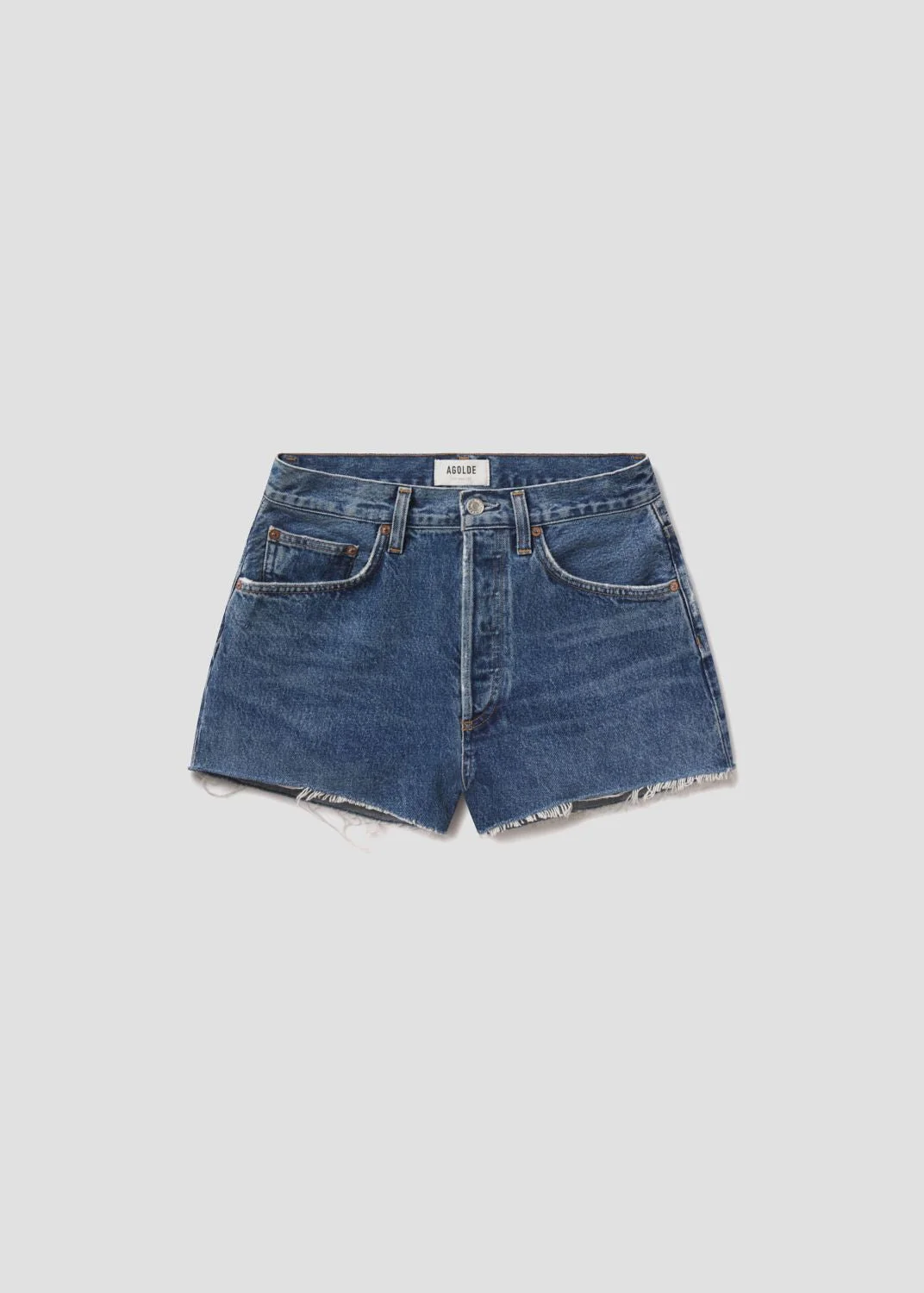 The Ridley Short in vintage indigo offers a sleek, high-rise, contoured fit that flatters effortlessly. With a nod to vintage style and a modern edge, they pair perfectly with an oversized blazer and loafers for a polished look, or with a relaxed knit tank and slides for a laid-back, effortless vibe. Crafted from regenerative cotton non-stretch denim, they offer a structured, durable feel while embracing sustainability. This fit is true to size. Looks Like: Dark vintage indigo denim short with fading, whiskering and a cut hem Feels Like: Rigid, non stretch cotton denim with an authentic vintage hand MORE DETAILS Closure: Button Fly Rise: 12 1/8" Inseam: 2 1/2" Leg Opening: 25 1/2" Model is 5'10" and is wearing a Size 27 Fabric: 100% Regenerative Cotton Care Instructions: Machine wash cold inside out with like colors. Do not bleach. Tumble dry low. Made in Turkey with imported materials A9237-1371-ENMR