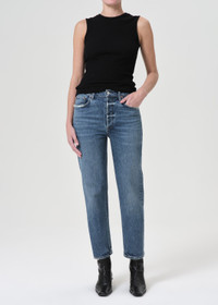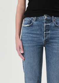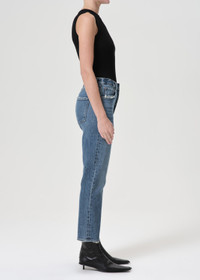 Our signature slim straight leg. With a better-than-vintage aesthetic, the Riley is an iconic brand favorite. The flattering high-rise and straight leg fits close to the body for a universally loved look. Available in stretch and non-stretch denim. This fit is true to size. Looks Like: Bright saturated indigo with subtle marbling Feels Like: Recycled cotton blend with a hint a of stretch for all day comfort and wearability MORE DETAILS Closure: Button Fly Rise: 11 1/2" Inseam: 26" Leg Opening: 14" Model is 5'10" and is wearing a Size 27 Fabric: 88% Cotton 11% Post Consumer Recycled Cotton 1% Elastane Care Instructions: Machine wash cold inside out with like colors. Do not bleach. Tumble dry low. Made in Turkey with imported materials A056C-1554-MR