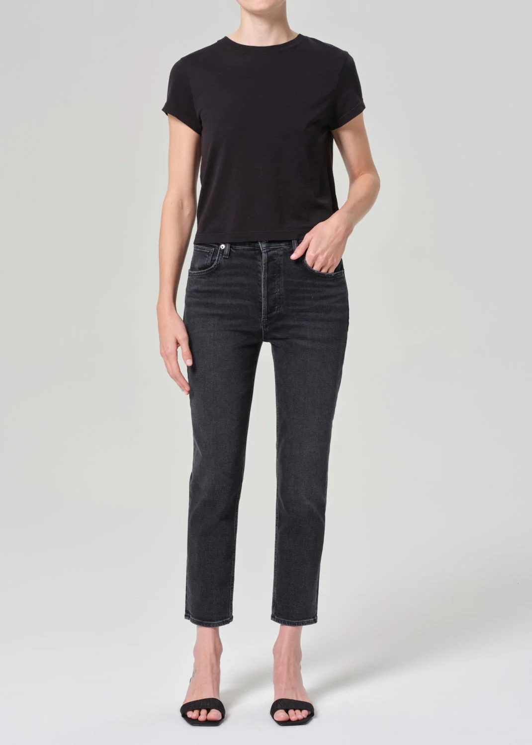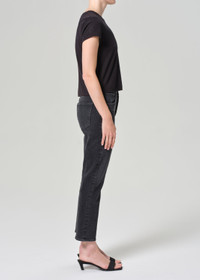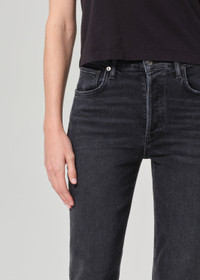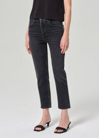 Our signature slim straight leg. With a better-than-vintage aesthetic, the Riley is an iconic brand favorite. The flattering high-rise and straight leg fits close to the body for a universally loved look. Available in stretch and non-stretch denim. This wash is crafted from stretch denim and runs true to size. Looks Like: Clean, washed black with a finished hem Feels Like: Comfort stretch denim, looks vintage but offers just the right amount of stretch MORE DETAILS Closure: Button Fly Rise: 11 1/2" Inseam: 26" Leg Opening: 14" Model is 5'10" and is wearing a Size 27 Fabric: 96% Regenerative Cotton 3% Elastomultister 1% Elastane Care Instructions: Machine wash cold inside out with like colors. Do not bleach. Tumble dry low. Made in Turkey with imported materials A056-1286_PNRMC