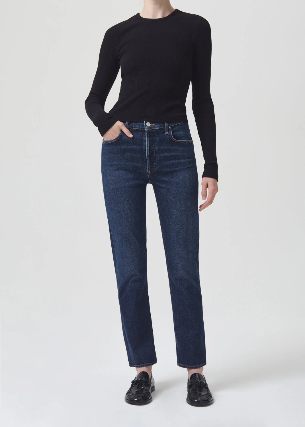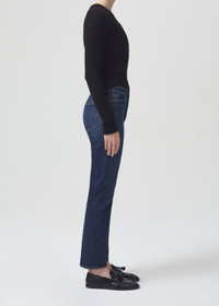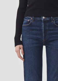 Our signature slim straight leg now with a longer inseam. With a better-than-vintage aesthetic, the Riley is an iconic brand favorite. The flattering high-rise and straight leg fits close to the body for a universally loved look. For a shorter inseam, shop the Riley Crop. This wash is crafted from stretch denim and runs true to size. Looks Like: Dark, saturated clean indigo with a finished hem Feels Like: Organic comfort stretch denim with a soft hand and vintage look MORE DETAILS Closure: Button Fly Rise: 11 1/4" Inseam: 28" Leg Opening: 14" Model is 5'10" and is wearing a Size 27 Fabric: 59% Organic Cotton 40% Rayon 1% Elastane Care Instructions: Machine wash cold inside out with like colors. Do not bleach. Tumble dry low. Made in Turkey with imported materials A9090B-1255_DDED