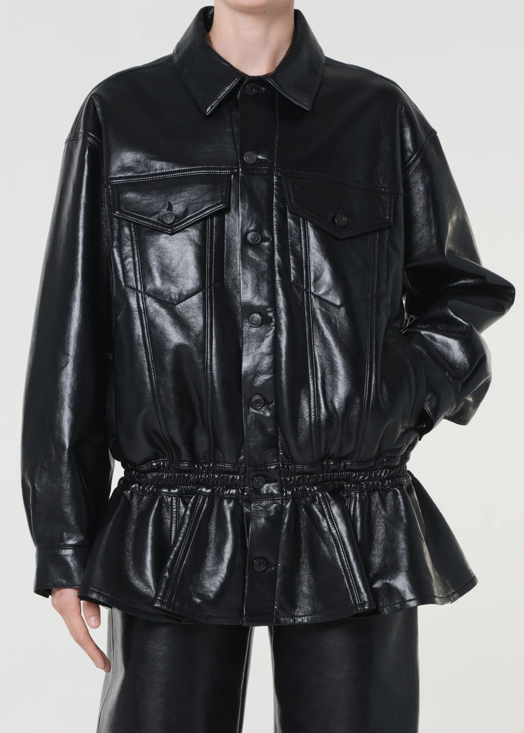 Matte black recycled leather jacket with a slightly structured, easy silhouette. Crafted from buttery recycled leather with subtle stretch, it offers a polished yet effortless fit—ideal for layering over tees, knits, or lightweight tops. This fit is true to size. Looks Like: Luxe black recycled leather jacket with matte finish Feels Like: Buttery, recycled leather with slight stretch for ease MORE DETAILS Model is 5'10" and wearing a size Small Fabric: 50% Recycled Leather, 30% Polyurethane, 10% Viscose, 10% Polyester Care Instructions: Machine wash cold inside out with like colors. Do not bleach. Tumble dry low. Made in USA with imported materials A5113-1285-DETOX