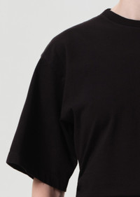 A fresh take on the classic tee. The Shari is cut from lightweight cotton jersey with exaggerated short sleeves and a slightly cropped fit. This fit is true to size. Looks Like: True black exaggerated short sleeve tee Feels Like: Lightweight jersey cotton MORE DETAILS Body Length: 19" Chest: 38" Sweep: 28 1/2" Shoulder to Shoulder: 20 3/8" Sleeve Length: 9 7/8" Model is 5'10" and wearing a size Small Fabric: 100% Cotton Care Instructions: Machine wash cold. Made in USA with imported materials A7392-1521-BLK