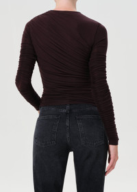 The Tania Twist Tee is a long-sleeve, ultra-soft tee with subtle twist detailing for a modern touch. Cut from lightweight fine-needle baby rib, it offers easy layering and a flattering fit. Root is a rich dark brown, perfect styled with high-rise denim or tailored trousers for effortless versatility. This fit runs true to size. Looks Like: Dark brown long sleeve tee with twist detailing Feels Like: Ultra-soft, lightweight fine needle baby rib MORE DETAILS Body Length: 19 1/2" Chest: 25 1/2" Sweep: 27" Shoulder to Shoulder: 12" Sleeve Length: 26" Model is 5'10" and wearing a size Small Fabric: 94% Lyocell, 6% Spandex Care Instructions: Machine wash cold inside out with like colors. Do not bleach. Tumble dry low. Made in USA with imported materials A7317-1618-ROTO