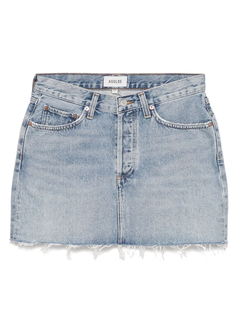 V-waist Mini skirt Highlights - Indigo blue - Button fly fastening - Classic five pockets - Belt loops - Distressed finish Imported Composition Regenerative Cotton 100%