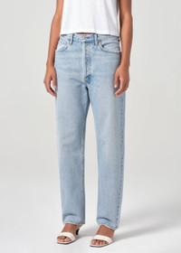 Cue the nostalgia. This 90's-inspired fit, crafted from vintage marbled indigo denim and regenerative cotton, offers a relaxed mid-rise, an eased fit through the hips, and a loose, straight leg. For styling, pair with a simple fitted tank and minimalist sandals for an effortless, casual look, or dress it up with a tucked-in silk blouse and loafers for a polished, refined vibe. This fit is true to size. Looks Like: Vintage marbled light indgo denim with fading and whiskering Feels Like: Rigid, non stretch cotton denim with a soft hand for all day wearability MORE DETAILS Closure: Button Fly Rise: 12 1/2" Inseam: 29" Leg Opening: 16" Model is 5'10" and is wearing a Size 27 Fabric: 100% Regenerative Cotton Care Instructions: Machine wash cold inside out with like colors. Do not bleach. Tumble dry low. Made in TURKEY with imported materials A069J-1206-FORCE