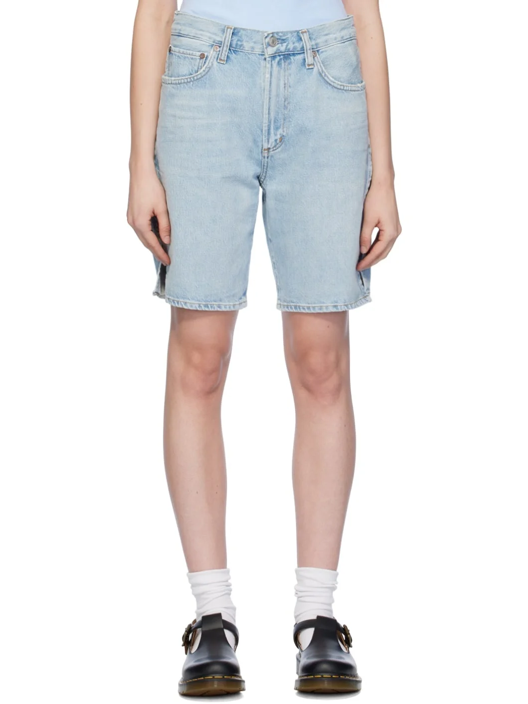 Non-stretch regenerative cotton denim shorts. Distressing and fading throughout. · High-rise · Belt loops · Five-pocket styling · Zip-fly · Vented outseams · Logo-engraved bronze-tone hardware · Contrast stitching in yellow Supplier color: Fragment