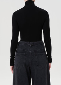 The Wilma Bodysuit is a sleek long sleeve turtleneck with a fitted silhouette, designed to layer effortlessly or stand alone. Cut from lightweight rib jersey with enhanced stretch, it offers a soft, comfortable feel that moves with you. True black adds a clean, modern touch—perfect paired with high-rise denim or tailored trousers for a streamlined finish. This fit is true to size. Looks Like: Clean black long sleeve turtleneck bodysuit Feels Like: Lightweight super soft rib jersey with enhanced stretch MORE DETAILS Body Length: 28 1/4" Sleeve Length: 26" Sweep: 24" Model is 5'10" and wearing a size Small Fabric: 95% Lyocell, 5% Spandex Care Instructions: Machine wash cold inside out with like colors. Do not bleach. Tumble dry low. Made in USA with imported materials A7408-1873-BLK